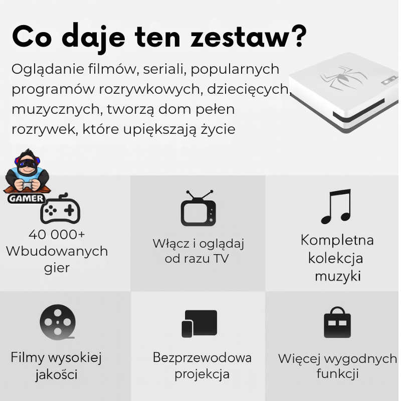 Nie musisz kupować kilku urządzeń — ten zestaw robi wszystko. Od grania w klasyki, przez oglądanie filmów i słuchanie muzyki, aż po bezprzewodowe przesyłanie obrazu.